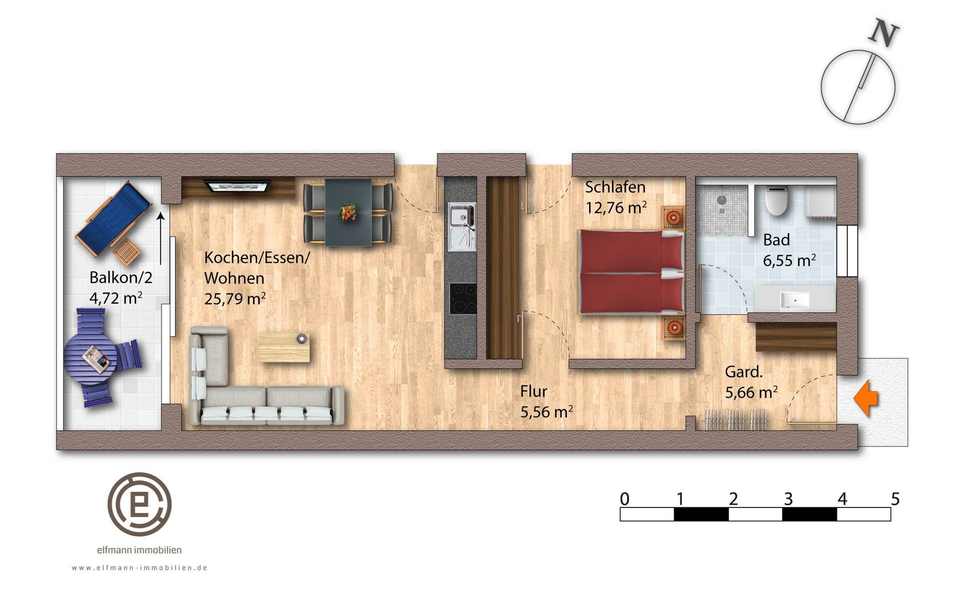 Die gemütliche Eigentumswohnung bietet durch die perfekte Raumaufteilung viel Platz für Paare oder Singles. Über die Garderobe gelangt man in einen längeren Flur über diesen sind alle Zimmer zugänglich. Das hochwertige Bad, der Schlafraum und der Wohn/Essraum. Über diesen gelangt man auch auf den Balkon.